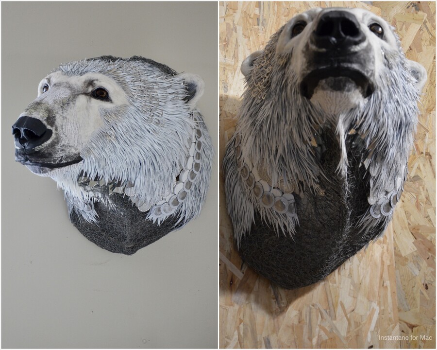 -papier aluminium, plumes de poule et métal de canette pour les yeux;