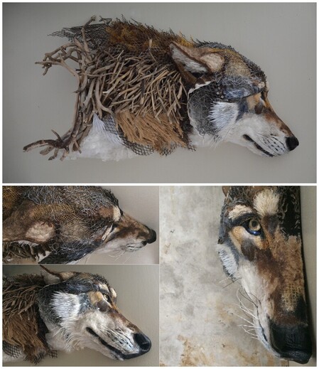 matériaux utilisés: carton, papier kraft, papier de soie, papier brillant d'emballage,kraft bitumé, canette aluminium, cuir et tissu de coque de smartphone, papier de couverture de livre, métal rouillé, poils de chien et de chat, masques chirurgicaux jetables, jute, crins et fibres de rembourrage de fauteuil, ficelle de lieuse, chainettes métalliques, sac plastique transparent, filet de pomme de terre en plastique, grille métallique rigide, grillage à poule, bouteille de lait en plastique, sachet en plastique gris irisé, canette métallique, papier bulle, plumes, clous de tapissier, bois de lierre, plastique d'enrubannage, feuillard.